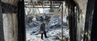 Чоловік і повітряний бій, бібліотека через 105 років, дитячі речі у попелі — лютий на Сумщині у фото 75-річний Анатолій Гольонка на місці російської атаки у Конотопі. Мілена Мороз/Суспільне Суми В ніч Новини Сум
