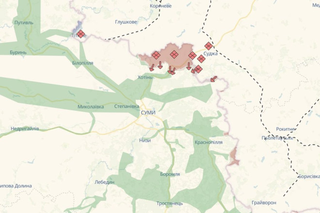 За даними аналітиків DeepState, станом на 24 лютого 2026 року російська армія просунулася у Сумській області на 268,9 км кв. Частково або повністю у "червоній" зоні населені пункти Хотінської, Юнаківської, Краснопільської та Миропільської громад.