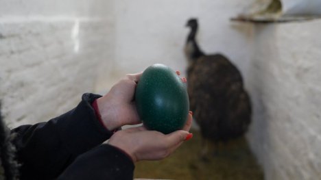 Самку назвали Лакі, бо так, каже Світлана, хотіли бійці. За два тижні вона знесла ще одне яйце, їх нині показують відвідувачам контактного зоопарку. Що далі з ними робитимуть – поки не придумали: “Даже не куштували їх. Вони такі цікаві, такі здаються як яйце Фаберже, ну нам шкода поки що”.