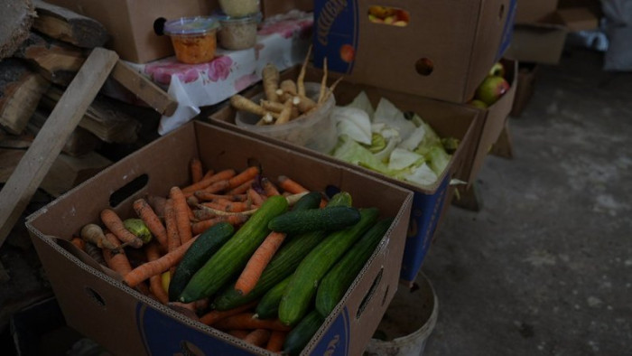 “Ми йому відразу зробили загородочку, він і ночував на вулиці, бо тепло було. І все. Ми йому відразу підійшли, так він і залишився з нами. Він їсть зернові, сіно подрібнюємо зелене, дуже полюбляє. А найулюбленіший десерт у нього яблука. Подивіться, скільки у нас яблук, він їсть яблука відрами, ріжемо йому й полюбляє оце. Влітку кабачки, огірки, таке що соковите все”, — поділилася пані Світлана.