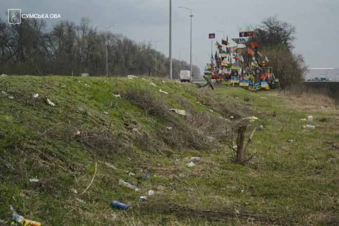 Як повідомили в Сумській ОВА, до прибирання долучилися небайдужі сум’яни — спільними зусиллями прибрали сміття та зайву рослинність. На стелі розміщені прапори бригад і підрозділів, які тримають оборону області, тому це місце є особливим для кожного, хто в’їжджає до міста.