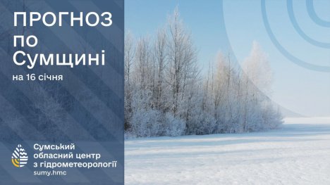 16 січня: хмарно з проясненнями, без істотних опадів, місцями туман, на дорогах ожеледиця. Вітер північно-східний, 5-10 м/с. Температура повітря по області вночі -13°..-18°, на півночі області до -23°, вдень -9°..-14°, по м.Суми вночі -15°..-17°, вдень -9°..-11°.