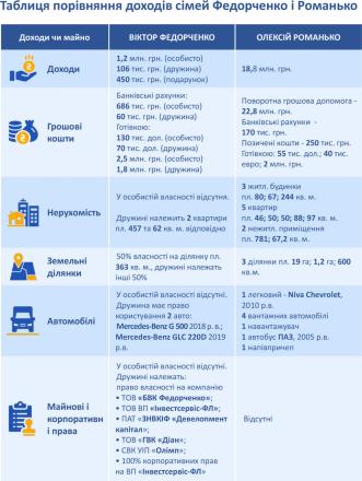 А от Олексій Романько за цей же рік отримав доходів на суму 18,8 мільйонів гривень, що у 10 разів більше за задекларовані статки Віктора Федорченка. До цієї суми увійшли прибуток від підприємницької діяльності (17 мільйонів 482 тисячі 543 гривні) та дохід від продажу корпоративних прав. Дохід дружини у декларації не вказаний, тож, очевидно, вона не працює.