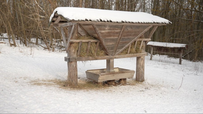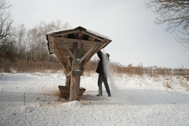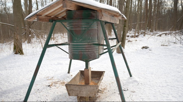 “Перевіряємо наявність корму. Якщо взяти цю годівницю, то тут 250–300 кілограмів корму. Вистачає максимум на тиждень”, — пояснює лісівник.