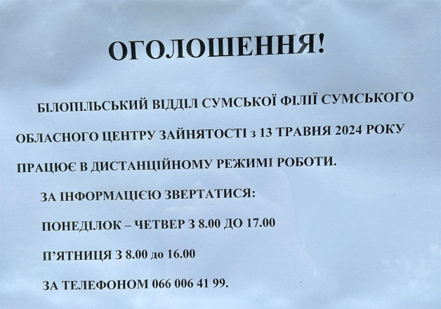 інформує, що з 13 травня 2024 року, на період дії воєнного стану, працівники Білопільського відділу Сумської обласної служби зайнятості переходять на дистанційний режим роботи.