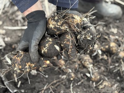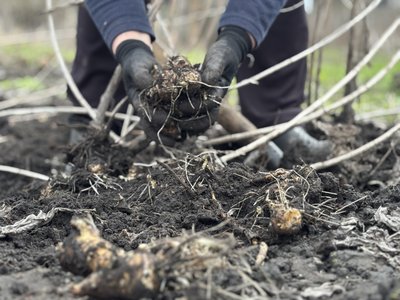 Жінка викопує бульби топінамбура, що залишилися у ґрунті з осені, говорить, взимку він витримує до 40 градусів морозу.