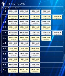 Завтра, 31 грудня, діятимуть графіки погодинних відключень відповідно до обсягів, доведених командою з НЕК “Укренерго”.