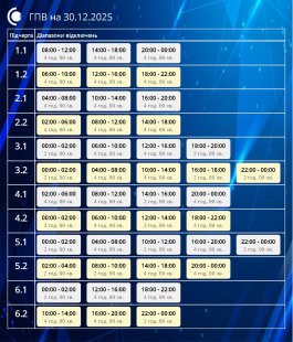 Завтра, 30 грудня, діятимуть графіки погодинних відключень відповідно до обсягів, доведених командою з НЕК “Укренерго”.
