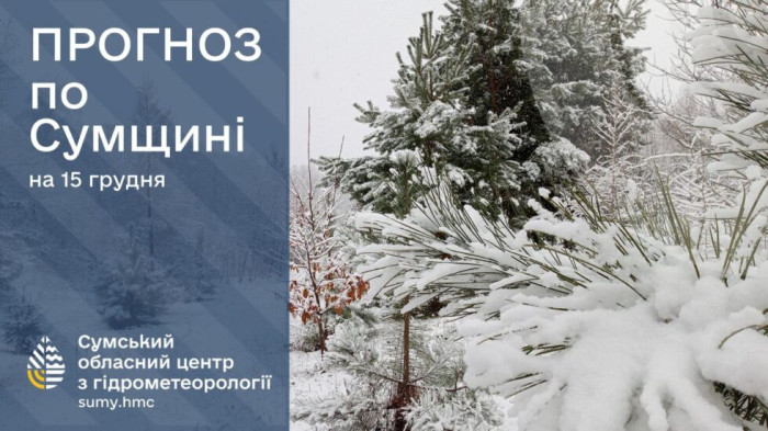 15 грудня: хмарно з проясненнями, вночі невеликий сніг, вдень сніг, мокрий сніг, місцями: налипання мокрого снігу, ожеледь, на дорогах ожеледиця. Вітер південно-західний, 5-10 м/с. Температура повітря по області вночі -4°..-9°, вдень -3°..+2°, по м.Суми вночі -5°..-7°, вдень близько 0°.