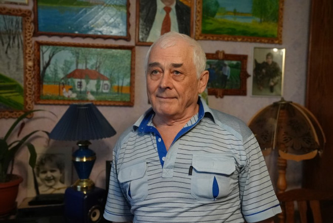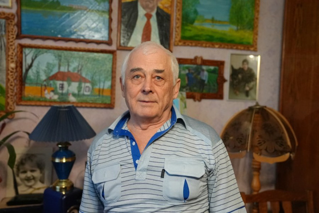 “На пенсії нічого робити… Це мій онук, це моя хата, то наша річка і міст, це себе вирішив намалювати. Це гуаш все”, – показує пан Віктор.