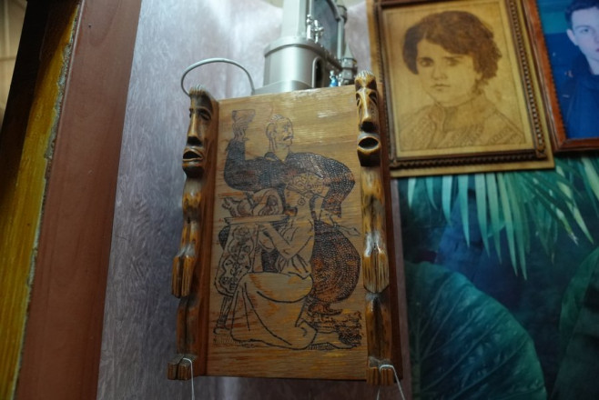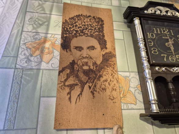 Меблі, рами дзеркал і фотографій, кухонні прилади, елементи декору в квартирі – справа його рук. Обідає родина, наприклад, під портретом Тараса Шевченка. Є і дощечка з автопортретом.