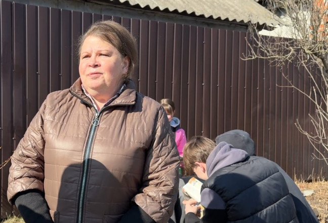 Директорка дитсадку Великої Чернеччини Тетяна Корж показує зруйновний російським дроном дитячий літній павільйон. Каже вибух пролунав в суботу 21 березня, близько 16:30.