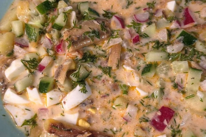 "Смажена картопля, яйця, свіжий огірок, редис, зелена цибуля, кріп — і обов'язково кілька в томаті. Заправка на свій смак", — саме таким рецептом поділилася пані Владислава у коментарі Суспільному. Дівчина родом із Шостки на Сумщині й каже, що це справжній кулінарний скарб їхнього краю.