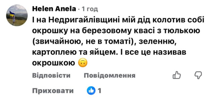 "І на Недригайлівщині мій дід колотив собі окрошку на березовому квасі з тюлькою (звичайною, не в томаті), зеленню, картоплею та яйцем", — написала жителька Сумщини.