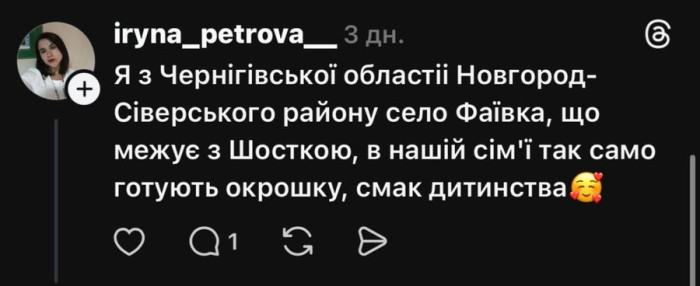 "Я з Чернігівської області, Новгород-Сіверського району, село Фаївка, що межує з Шосткою, у нашій сім'ї так само готують окрошку. Смак дитинства", — написала Ірина Петрова.