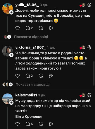 Також під дописом Владислави у Threads люди розповідали, що окрошку з кількою в томаті готують і на півночі Чернігівщини, а на Донеччині готують борщ із кількою у томаті.