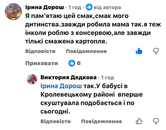 "Пам'ятаю цей смак, смак мого дитинства. Завжди робила мама так. Я теж інколи роблю з консервою, але завжди тільки смажена картопля", — написала Ірина Дорош.