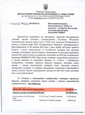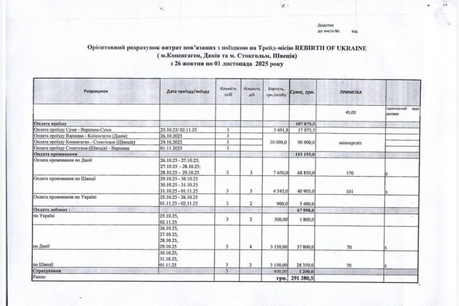Ресурс SumyToday опублікувало документ орієнтовного розрахунку витрат на цю поїздку. Йдеться про 291,38 тис. грн з бюджету громади (0217693 "Інші заходи, пов’язані з економічною діяльністю").