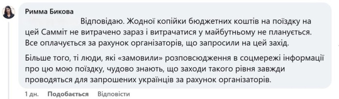 Скрин відповіді Римми Бикової щодо витрат на відрядження у Дубай. Суспільне Суми