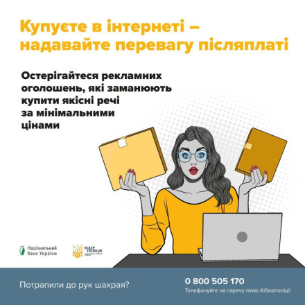 Поліція Сумщини наголошує:- купуючи в Інтернеті, надавайте перевагу післяплаті. Остерігайтеся оголошень, які заманюють купити якісні речі за низькими цінами. Обирайте лише перевірені ресурси для здійснення онлайн-покупок.