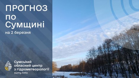 2 березня: хмарно з проясненнями, без істотних опадів, на дорогах ожеледиця. Вітер західний, 5-10 м/с. Температура повітря по області вночі -1°..-6°, вдень 0°..+5°, по м.Суми вночі -1°..-3°, вдень +1°..+3°.