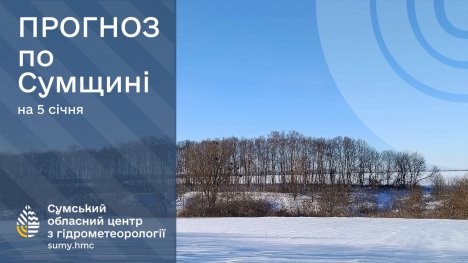 5 січня: хмарно з проясненнями, вночі невеликий, сніг, вдень без істотних опадів, на дорогах ожеледиця. Вітер південно-західний, 3-8 м/с. Температура повітря по області вночі -8°..-13°, вдень -4°..-9°, по м.Суми вночі -8°..-10°, вдень -6°..-8°.