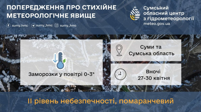 Вночі 27 – 30 квітня по Сумській області та м.Суми очікуються заморозки у повітрі 0°..-3°.