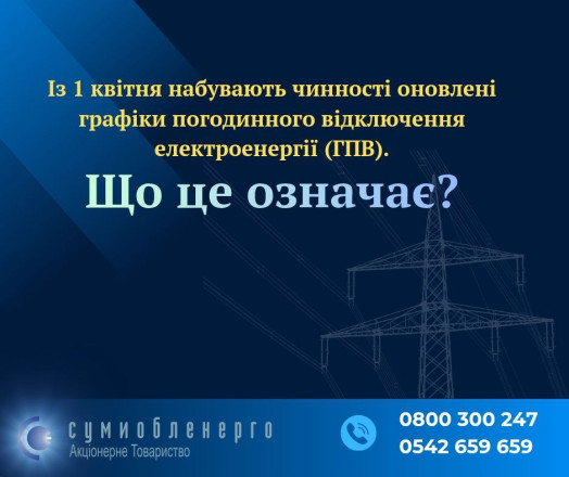 У разі застосування будь-яких обмежень у електропостачанні ми повідомляємо вас на офіційних ресурсах Товариства (сайт, сторінка в фейсбуці та телеграм-канал). Оновлені ГПВ діятимуть до 1 жовтня, після чого вони будуть переглянуті та перезатвердженні, відповідно до Інструкції, повідомили в “Сумиобленерго”.