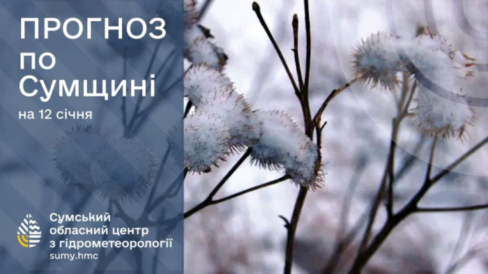 12 січня: хмарно з проясненнями, без істотних опадів, слабкий туман, на дорогах ожеледиця. Вітер західний, 5-10 м/с. Температура повітря вночі в південній половині області -12°..-17°, в північній -17°..-22°, вдень -8°..-13°, по м.Суми вночі -13°..-15°, вдень -10°..-12°.