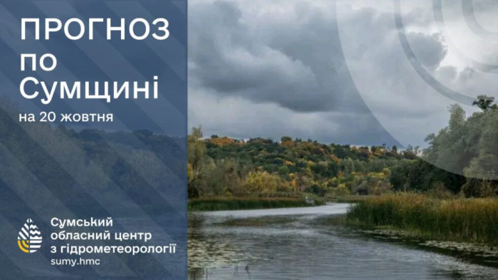 20 жовтня: хмарно, помірний дощ, вночі місцями з мокрим снігом, слабкий туман. Вітер північно-західний, 5-10 м/с. Температура повітря по області вночі +2°..+7°, вдень +4°..+9° по м.Суми вночі +4°..+6°, вдень +7°..+9°.