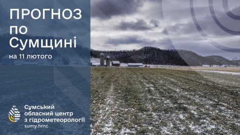 11 лютого: хмарно з проясненнями, без опадів, на дорогах місцями ожеледиця. Вітер північно-східний, 3-8 м/с. Температура повітря по області вночі -7°..-12°, вдень -1°..-6°, по м.Суми вночі -9°..-11°, вдень -4°..-6°.