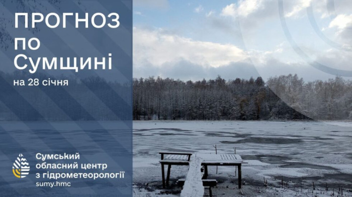 28 січня: хмарно, сніг з дощем, місцями туман, ожеледь, на дорогах ожеледиця. Вітер південний, 7-12 м/с. Температура повітря по області вночі -3°..-8°, вдень -3°..+2°, по м.Суми вночі -5°..-7°, вдень 0°..+2°.