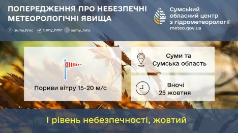 25 жовтня: хмарно, помірний дощ, вночі місцями значний. Вітер південний, 7-12 м/с, вночі пориви 15-20 м/с. Температура повітря по області вночі +7°..+12°, вдень +10°..+15°, по м.Суми вночі +10°..+12°, вдень +12°..+14°.