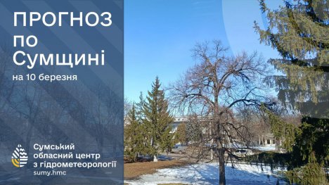 10 березня в області прогнозують мінливу хмарність. Вітер західний, 5–10 м/с. Вночі на дорогах місцями можлива ожеледиця, тому водіям слід бути обережними. Температура повітря по області вночі коливатиметься від -3° до +2°, вдень підніметься до +7°..+12°. У Сумах вночі близько 0°, вдень очікується +10°..+12°.