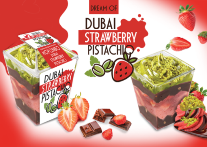У сміливій новинці «Dubai strawberry-pistachio» «Ласунка» майстерно поєднала найпопулярніші смаки світу – сорбет зі стиглої полуниці, оксамитове шоколадне морозиво, ніжний соус з фісташки та ароматний соус з шоколаду. Завершує цю симфонію смаку хрустке катаїфі – витончене східне тісто, яке додає виняткової текстури. Ідеально для тих моментів, коли хочеться дозволити собі щось справді особливе.