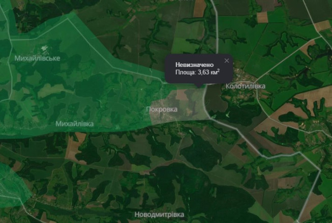Сьогодні аналітики позначили сірим кольором територію площею більне 3 кв. км на північний схід від Краснопілля. Нині йдуть бої за село Покровка.