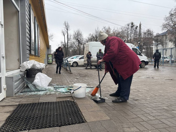 У розташованому поруч супермаркеті пошкоджений центральний вхід, прибиральниця підмітає скло. Керівник магазину Максим розповів, що в момент удару в тамбурі був покупець.