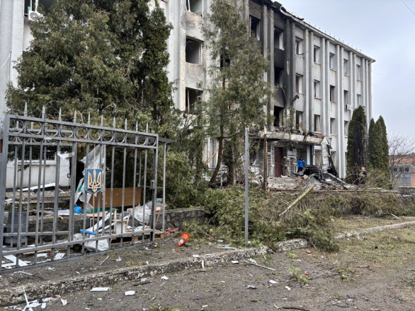 Фасад будівлі потрощений, вибиті всі вікна, вхід захаращений гілками дерев та будівельним сміттям.