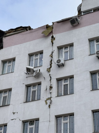 "Лікарню і людей врятувало те, що дрон влучив не в сам дах, а в плиту, козирок, як простіше сказати. І ця масивна плита взяла на себе весь удар.