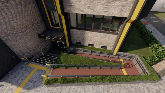 - Доступна архітектура: панорамний ліфт, пандус до укриття, адаптовані входи, безпечні місця для паркування велосипедів та авто, а також безпечний маршрут до школи.