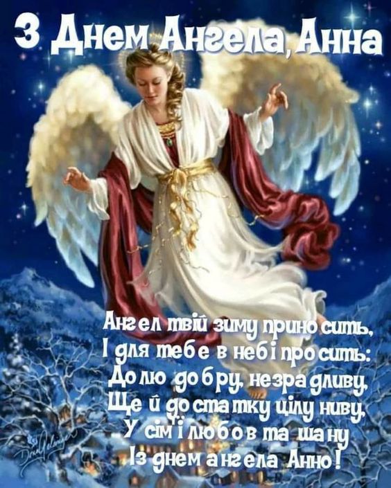 Анна, вітаю з Днем ангела. Бажаю тобі здоров’я, удачі, терпіння і благополуччя. Щоб тобі завжди допомагав твій Ангел, а життя було гармонійним і щасливим