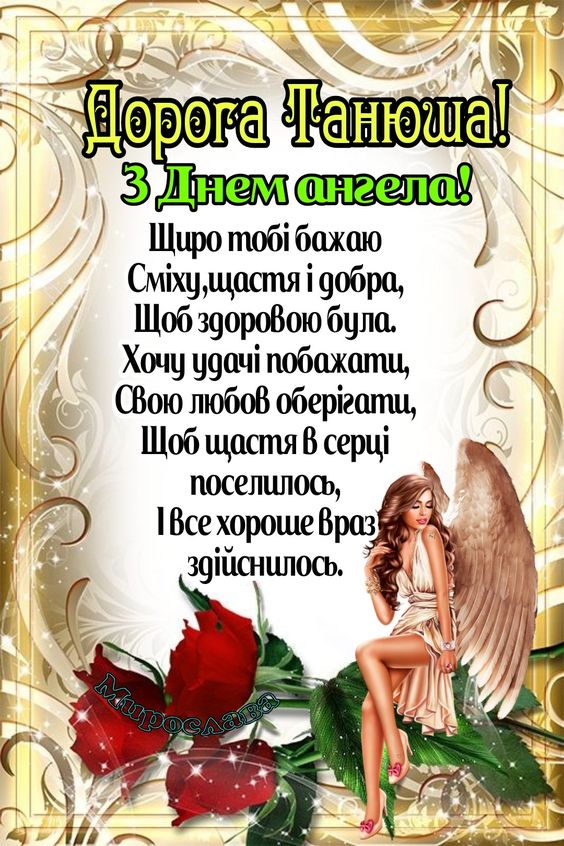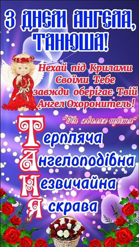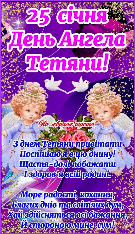 Вітаю з Тетяниним днем та бажаю бути вічно закоханою людиною у своє життя, душею веселої компанії, надією та натхненням близьких. Нехай для тебе розквітають яскраві мрії, лунають радісні пісні, грає чудова музика та малюються дивовижні картини кольорами щастя.