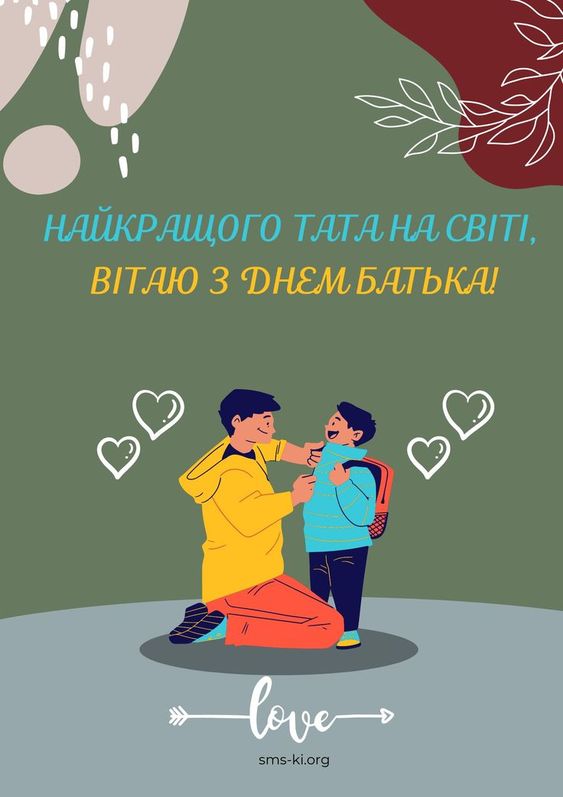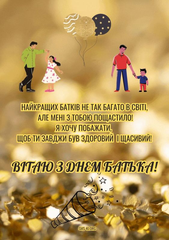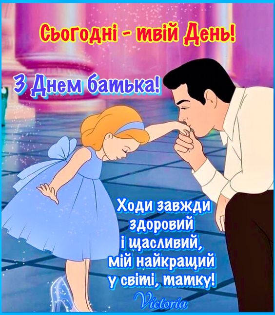 Татко, вітаю тебе з Днем батька! Бажаю тобі щастя, щоб життя було в радість і не з’їла рутина, щоб було здоров’я міцним, а серце – вічно молодим. Нехай доля частіше нагороджує за всі старання твої та завжди оберігає, що б не сталося, і де б не був ти. Бажаю, щоб удача завжди була тобі вірна, і була радісною кожну мить!
