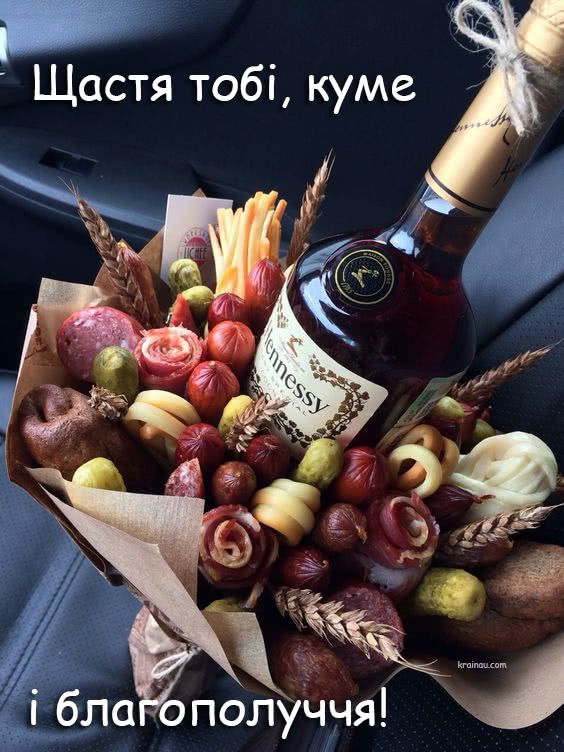 Вітаю, куме! Бажаю тобі щасливого сьогодення і ще кращого майбутнього! Хай у тебе буде мішечок грошей, перевірені життям вірні друзі, сімейний затишок і кохана кума завжди поряд. Хай смачно пахне у домі пирогами та варениками, щастям і коханням! З щасливою посмішкою прокидайся і засинай!
