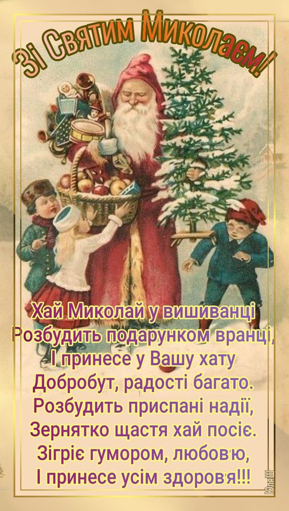 Вітаю з Днем святого Миколая і хочу побажати приємних подарунків та солодких сюрпризів, миру і блага в сім’ї, доброго щастя і міцного здоров’я, великої удачі та чудових ідей, відкритої душі і світлої надії.