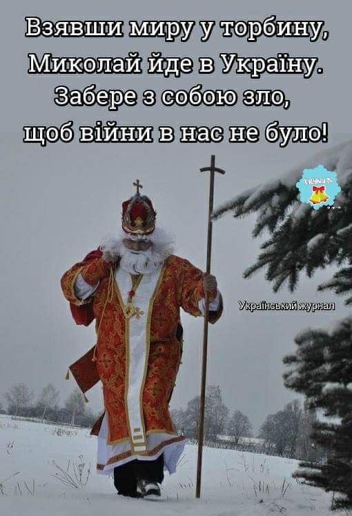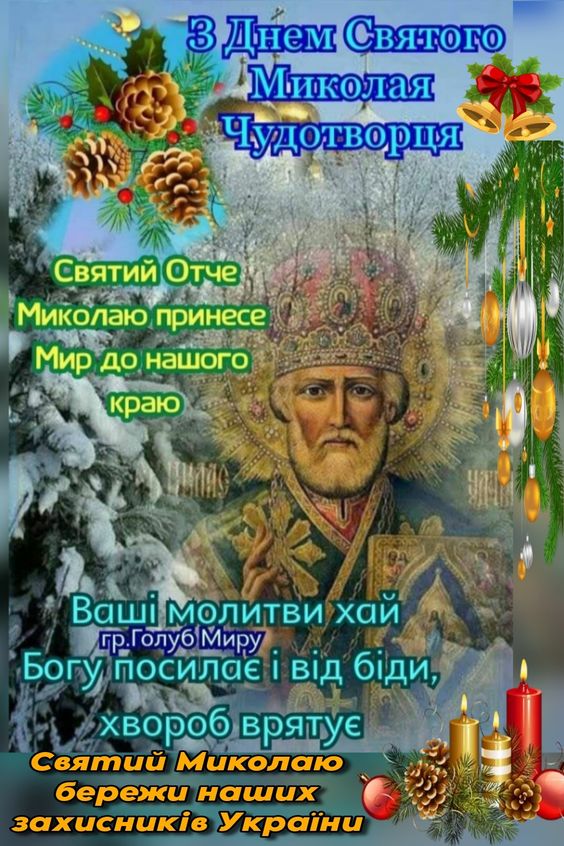 Вітаю з Днем святого Миколая! Бажаю сонячного настрою, прекрасного самопочуття, багато дзвінкого і радісного сміху. Нехай здійсняться всі бажання і виправдаються надії! І звичайно ж бажаю мирного неба і якнайшвидшої перемоги України!