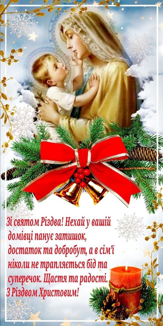 Вітаю з Різдвом Христовим! Хай Матінка Божа накриє Україну Своїм Омофором, щоб попри війну у це чарівне свято виконувались всі бажання. Нехай ваш будинок наповниться любов’ю, турботою і затишком, а Різдвяна зірка завжди освітлює життєвий шлях.