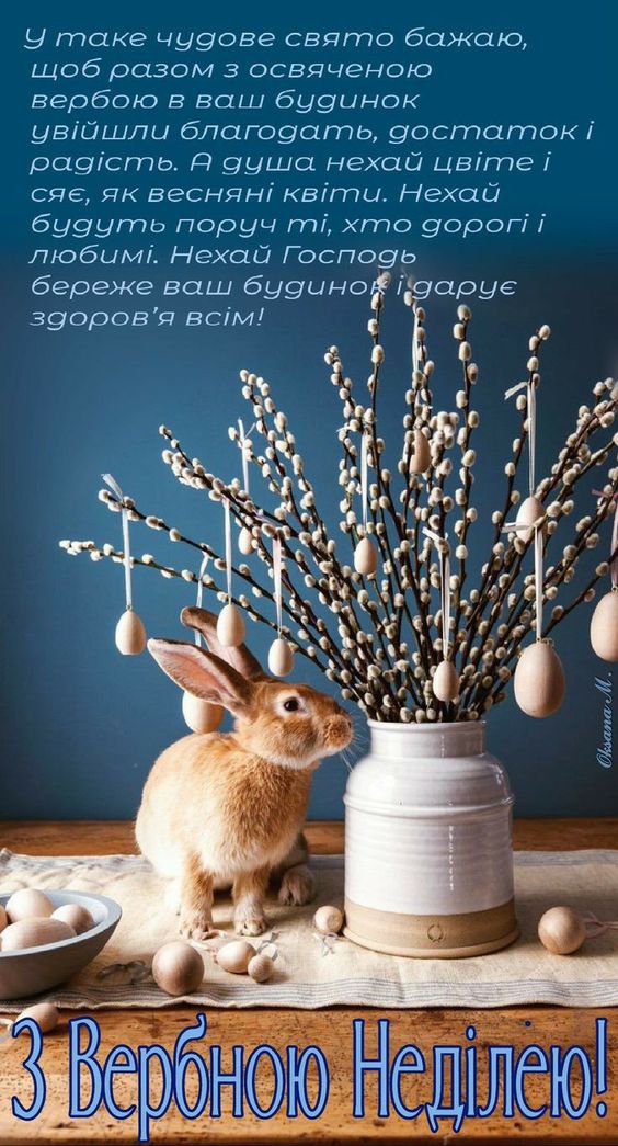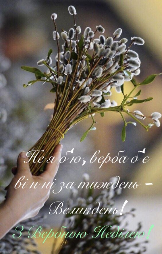 Вітаю вас із Вербною неділею! Від щирого серця бажаю здоров’я всім членам вашої родини, миру вашому дому та світлої весни! Нехай усі нещастя та прикрощі обійдуть вас стороною, і тільки радість та добро знайдуть до вас дорогу!