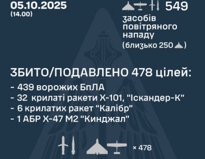 За попередніми даними, станом на 14.00, протиповітряною обороною збито/подавлено 478 повітряних цілей: