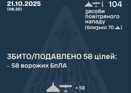 За попередніми даними, станом на 08:30, протиповітряною обороною збито/подавлено 58 ворожих БпЛА типу Shahed, Гербера і дронів інших типів на півночі, півдні та сході країни.